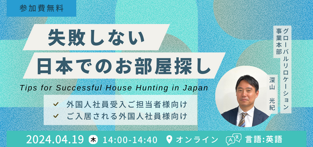 In this seminar, we will discuss tips for successful house hunting in Japan in English, while clarifying the current situation surrounding foreign employees’ housing search in Japan as the housing search season is about to get into full swing.