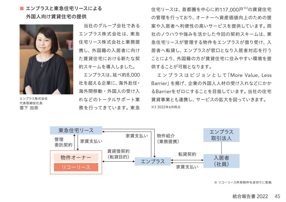 当社の取組みについては、2022年3月1日に当社ホームページにてお知らせしました「東急住宅リースとエンプラスの業務提携契約締結について」をご報告させていただております。
