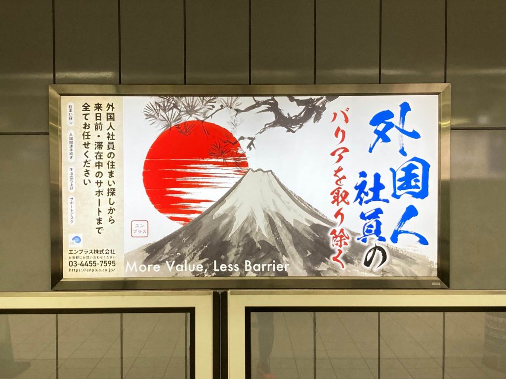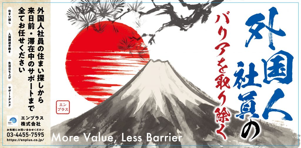 なお看板デザインは、エンプラスのVisionとしても掲げている「More Value,Less Barrier」を視覚的に表現するため、「外国人社員のバリアを取り除く」をキャッチに、日本(和)をイメージした背景を分かりやすくシンプルなもので構成しております。
