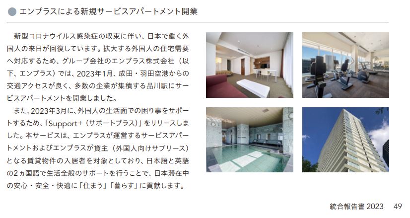 当社の取組みについては、2023年1月のサービスアパートメントの新規開業(MONDESTAY東京品川)や、同年3月に外国人材の「住まう」「暮らす」に係る様々なお困りごとをサポートするためにリリースしました「Support+」について、ご報告させていただいております。