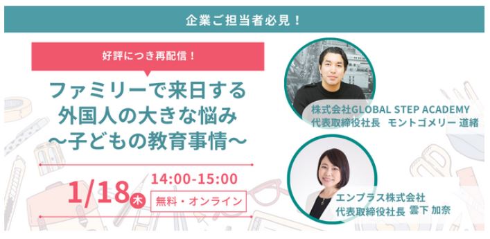 当社では、昨年12月にグローバル教育分野において事業展開されるGlobal Step Academyの代表取締役社長 モントゴメリー氏にウェビナーにご登壇頂き、弊社代表取締役社長 雲下との対談形式で、インターナショナルスクール事情、インターナショナルスクール以外のオプションなど、外国人材にとっての子女教育の実態や、受入企業としてどのような支援ができるのかをご紹介させていただきました。