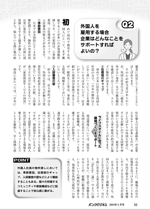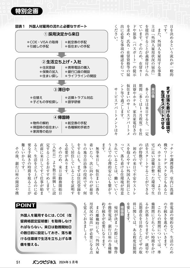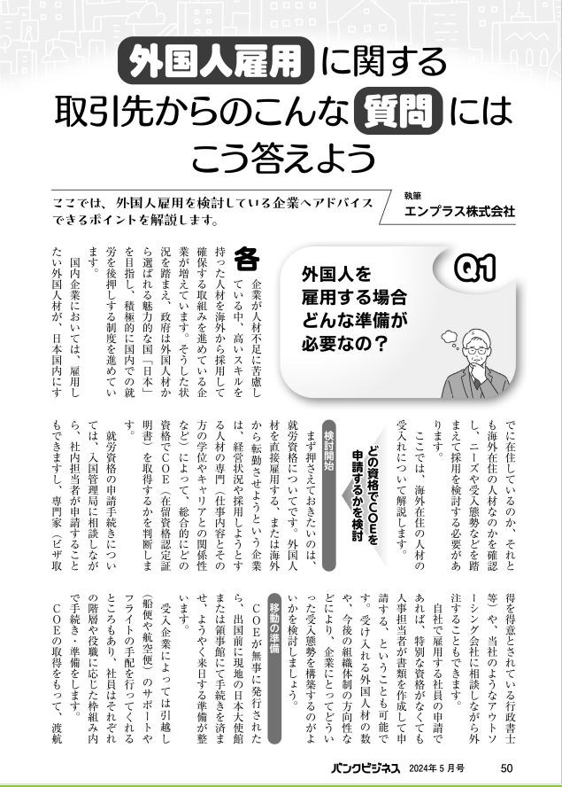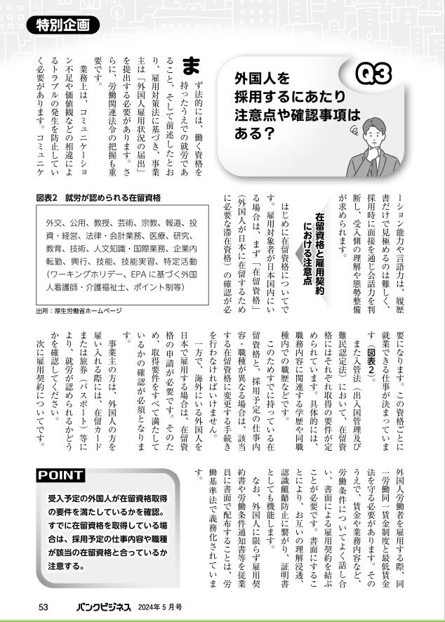 金融機関で働く人のための実務解説誌【バンクビジネス】の特集企画「外国人雇用を検討する取引先へのアドバイス」において、記事を執筆いたしました