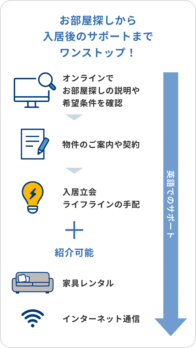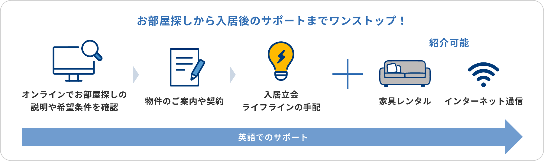 お住まいが決まった後も入居時の水道光熱、インターネット等のライフラインのセットアップ、入居中の各種問合せにもバイリンガルスタッフがサポートいたします。さらには、退去時の各種手続きまでワンストップでサポートいたしますので、ご安心ください。