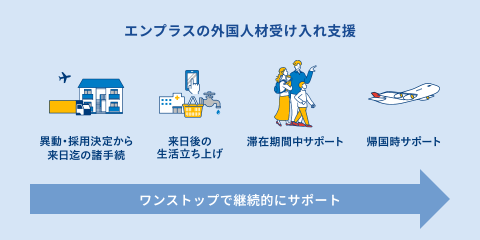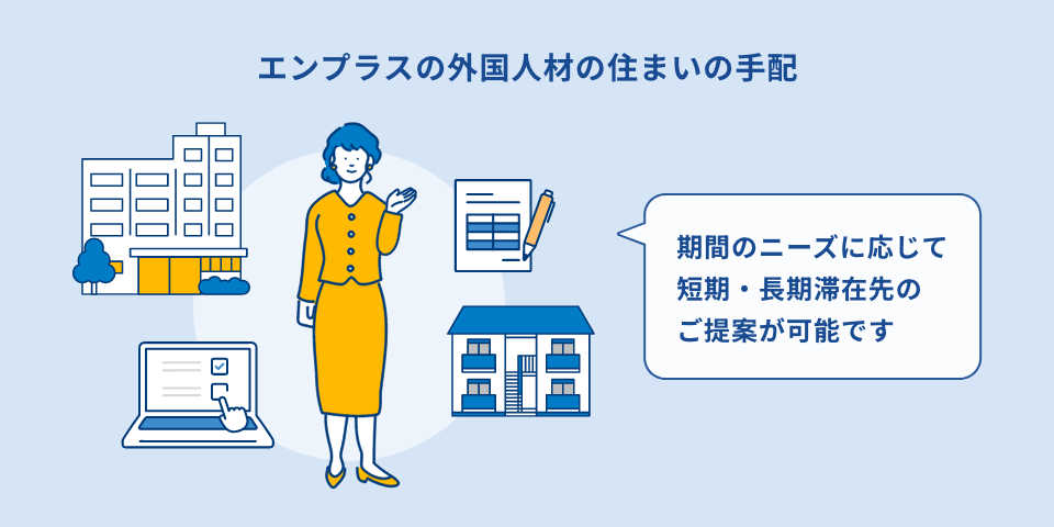 エンプラスでは、短期から長期まで、外国人材の「暮らす」をトータルサポートいたします。